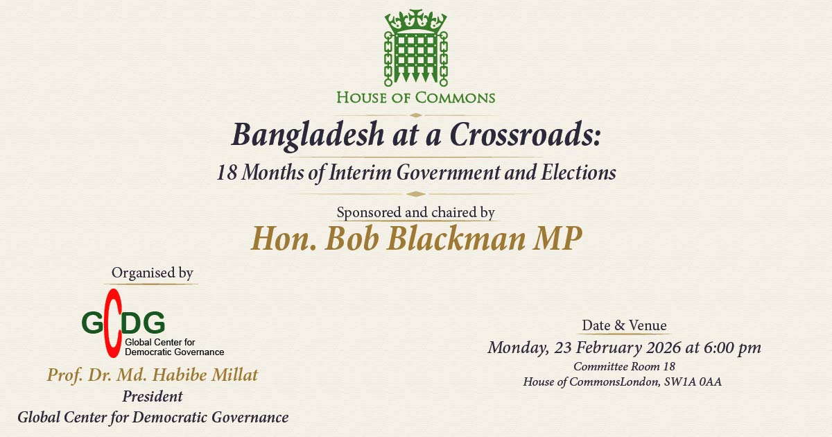 A high-level parliamentary discussion titled “Bangladesh at a Crossroads: 18 Months of Interim Government and Elections” will take place at the House of Commons on Monday, 23 February 2026, from 6:00 pm to 7:30 pm in Committee Room 18. Organised…